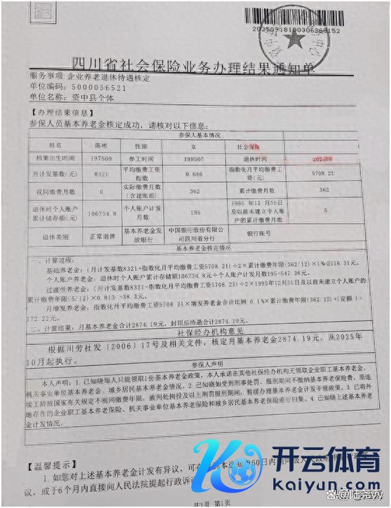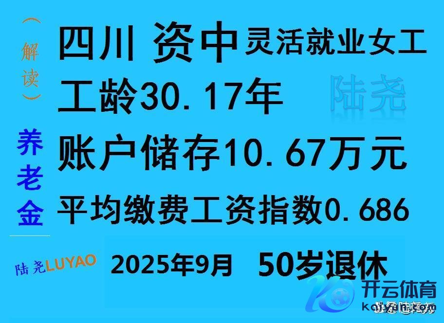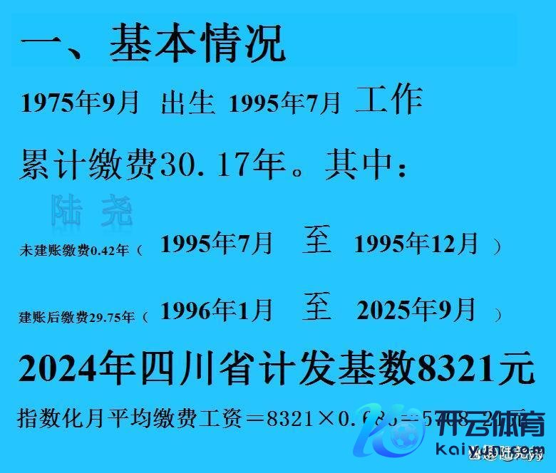 今天,解读一位资中县天真服务女工在2025年9月年满50岁退休时待业金的具体情况。 一、基本情况 这位女工降生于1975年9月,早在1995年7月就运行交纳社保。她累计缴费时长达30.17年。这30多年的缴费历程还不错细分为两个阶段,其中未建账缴费工夫为0.42年,即从1995年7月至1995年12月;建账后缴费工夫长达29.75年,从1996年1月一直捏续到2025年9月。2024年四川省的计发基数为8321元,而她的平均缴费工资指数是0.686。 通过推断,咱们不错得出她的指数化月平均缴费