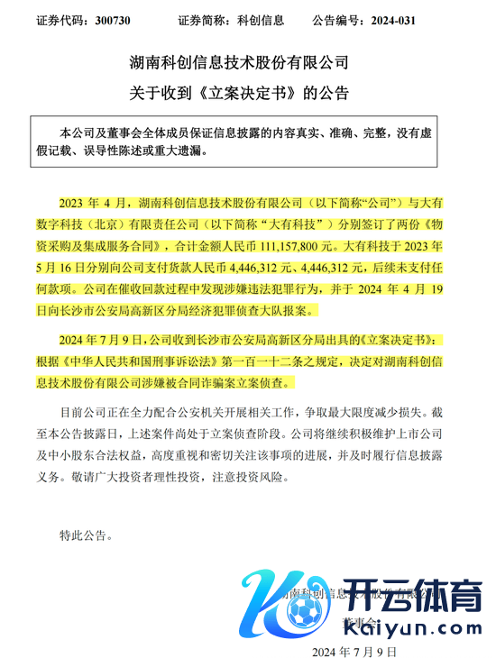 2024年7月9日,科创信息收到长沙市公安局高新诀别局出具的《立案决定书》:字据《中华东说念主民共和国刑事诉讼法》第一百一十二条之规章,决定对科创信息涉嫌被合同欺诈案立案窥探。