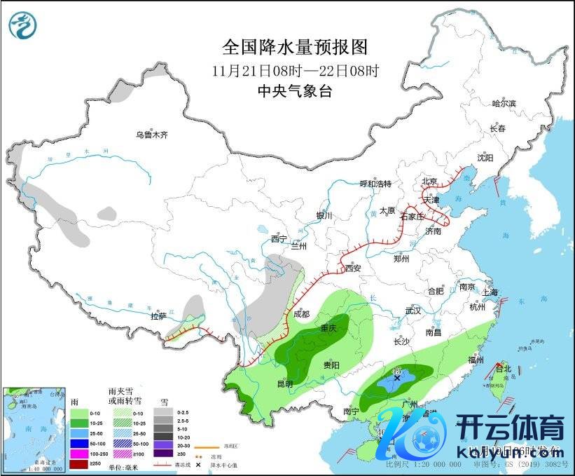 11月21日08时至22日08时,新疆北疆北部和南疆盆地、西藏东部和西部、青海南部、甘肃南部、西南地区北部、四川南部等地部分地区有小雪或雨夹雪。湖南西部、江南东部和南部、西南地区东部和南部、华南大部、台湾岛等地部分地区有小到中雨,其中,湖南南部、广西东北部、广东西北部、海南岛东北部等地部分地区有大雨(25~45毫米)。