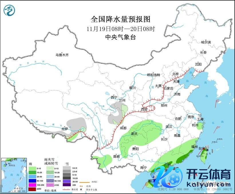 11月19日08时至20日08时,西藏东部和南部、甘肃中南部、川西高原北部等地部分地区有小雪或雨夹雪。福建东南部、华南南部、海南岛、台湾岛等地部分地区有中到大雨,其中,广东西南部沿海、海南岛东北部等地部分地区有暴雨(50~65毫米)。