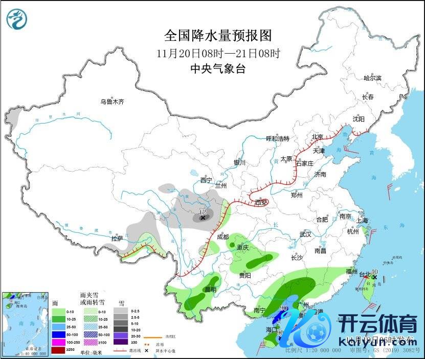 11月20日08时至21日08时,新疆南疆西部山区、西藏东部和南部、青海南部、甘肃南部、西南地区北部等地部分地区有小雪或雨夹雪,其中,川西高原北部等地部分地区有中雪,川西高原北部等地局地暴雪(10~12毫米)。云南西南部和中部、广西东北部、华南南部、广东西北部、海南岛等地部分地区有中到大雨,其中,广东西南部、海南岛东北部等地部分地区有暴雨(50~90毫米)。