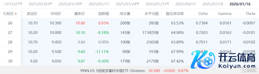 3倍作念多富时中国ETF-Direxion(YINN)有特出98000份看涨期权成交,尔后又有38000份被买入。该期权于2026年1月到期、行权价在27好意思元,两份订单统统破耗了约1.35亿好意思元。