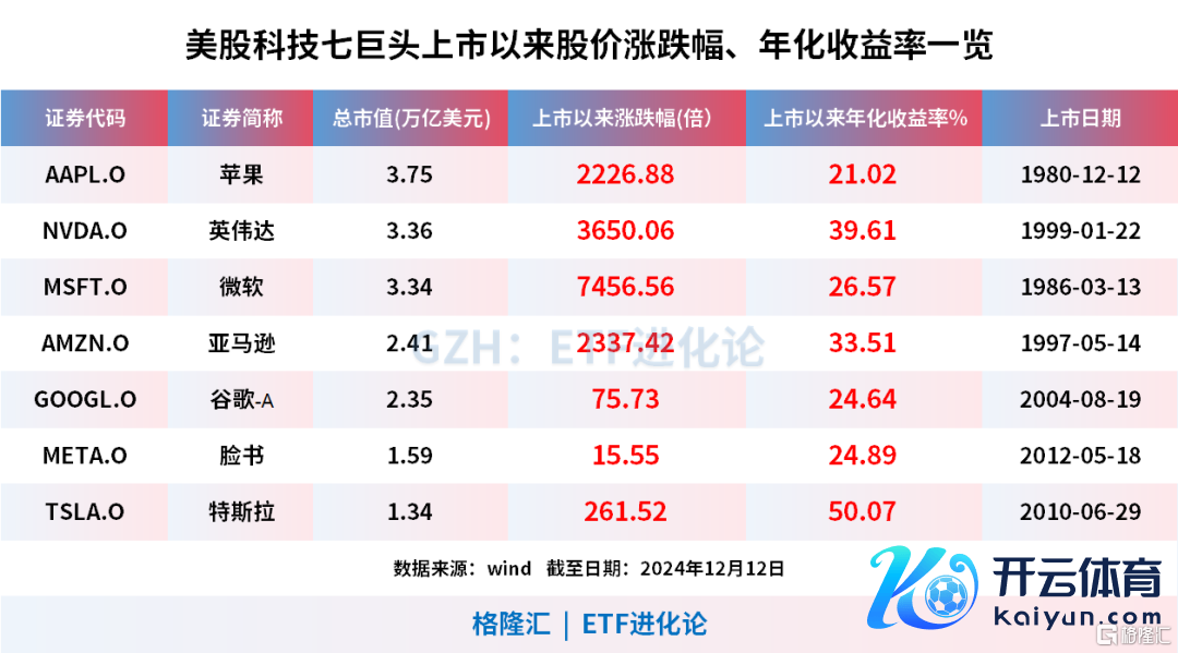 好意思股科技七巨头上市以来股价涨跌幅、年化收益率一览:
