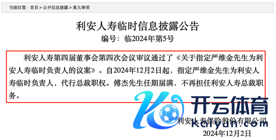 12月2日,利安东说念主寿在官网公开流露了一则临时信息流露公告称,公司第四届董事会第四次会议审议通过了《对于指定严维金先生为利安东说念主寿临时负责东说念主的议案》。自2024年12月2日起,指定严维金先生为利安东说念主寿临时负责东说念主,代行总裁权利。傅杰先生任期届满,不再担任利安东说念主寿总裁职务。