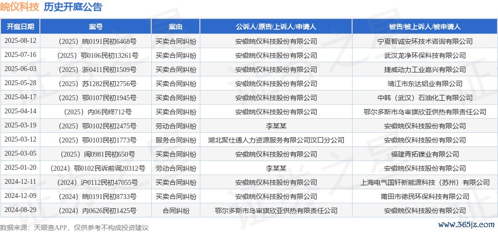 案号:(2025)皖0191民初6468号审理法院:合肥高新时间产业建立区东说念主民法院案由:生意条约纠纷当事东说念主信息: 原告/上诉东说念主:安徽皖仪科技股份有限公司 被告/被上诉东说念主:宁夏智诚安环时间商议有限公司开庭日历:2025年8月12日阐明统计,近一年内以安徽皖仪科技股份有限公司为当事东说念主的历史开庭公告有13则,其中案由为“生意条约纠纷”的公告以9则居首,其次为“服务条约纠纷”有2则,“条约纠纷”有1则。历史开庭公告如下: