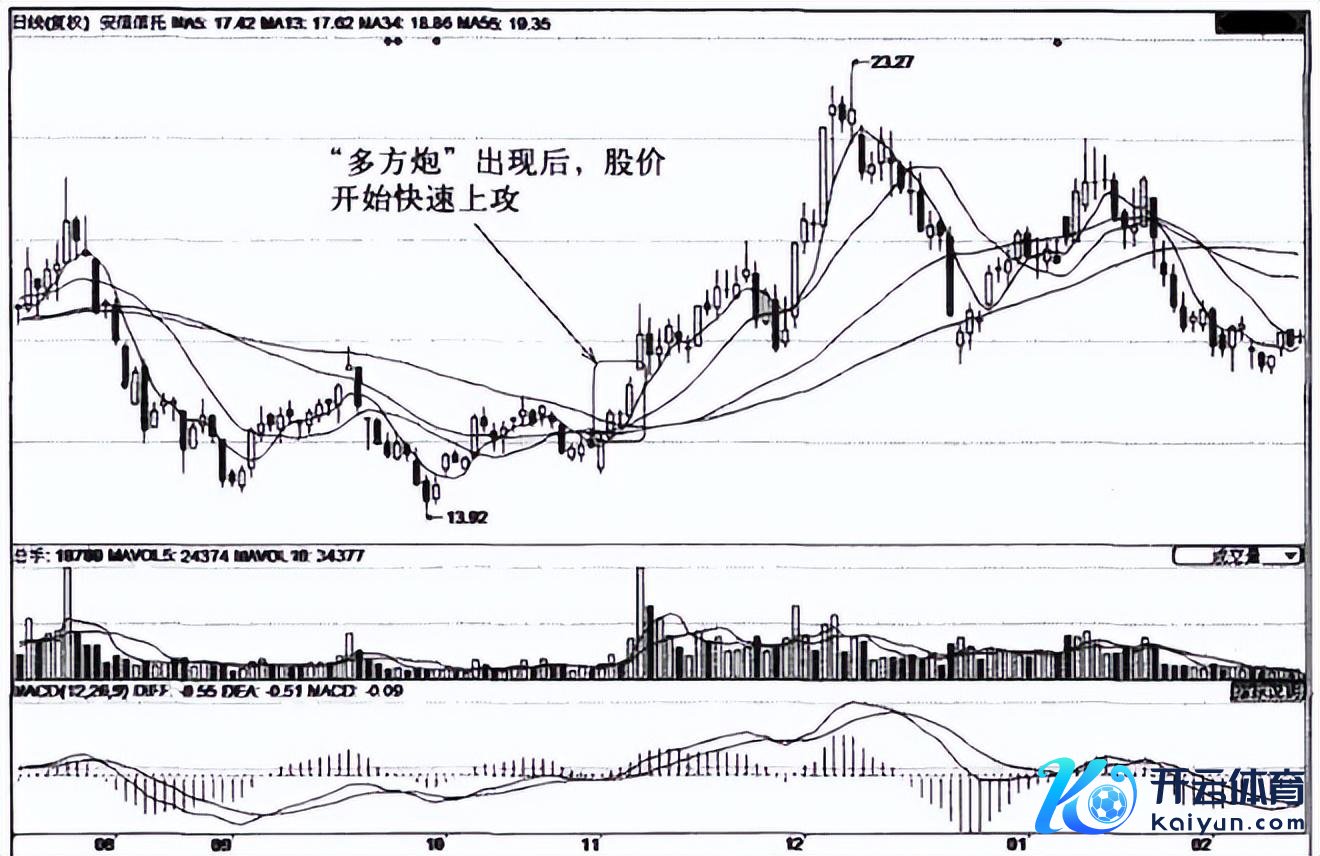 “多方炮”是指在走势上呈现出“两阳夹一阴”的K线形态。特殊的“三阳夹两阴”称“叠叠多方炮”。