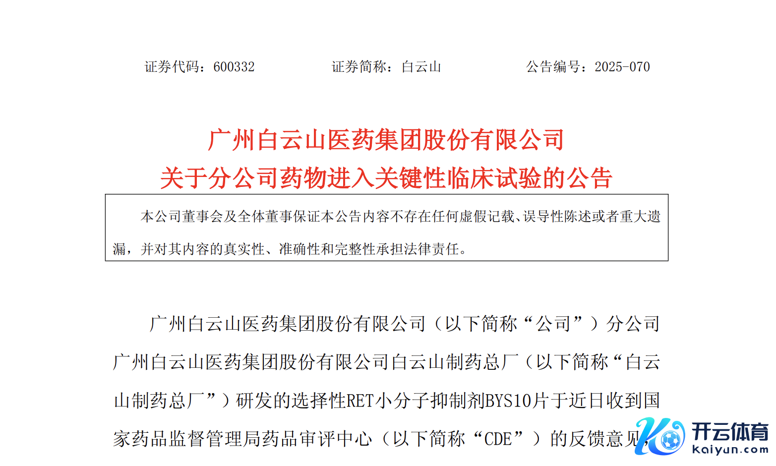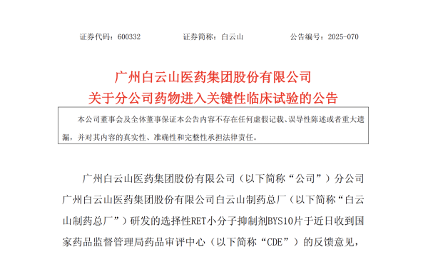 9月15日,广州白云山医药集团股份有限公司(股票代码:600332.SH万博manbext网页版登录,00874.HK)发布对于分公司药物进入要津性临床考研的公告,白云山制药总厂研发的选拔性RET小分子遏止剂BYS10片收到国度药品监督责罚局药品审评中心的反应观点,喜悦BYS10片异日接管Ⅱ期单臂临床考研肯求上市。这意味着BYS10片进入要津注册临床考研,有望成为国产更正抗肿瘤药物的代表性家具,RET突变实体瘤将迎来调治畛域新冲破。