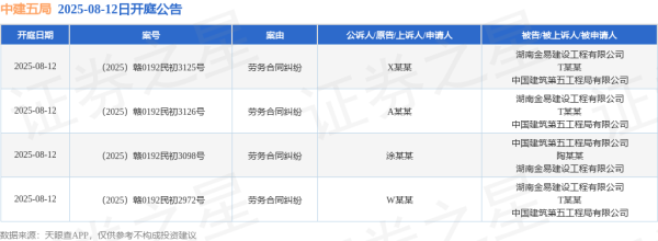 本站音信,字据天眼查APP清楚,近日公布了4则中国确立第五工程局有限公司行动被告/被上诉东说念主的开庭公告,案由为劳务协议纠纷万博manbext网页版登录app官网,开庭日历为2025年8月12日。详备本体如下: 数据起首:天眼查APP 以上本体为本站据公开信息整理万博manbext网页版登录app官网,由AI算法生成(网信算备310104345710301240019号),不组成投资提倡。